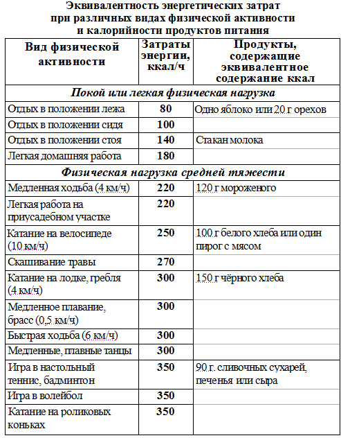 Доказано, что повышают чувствительность тканей к инсулину нормализация веса и увеличение физических нагрузок. Часто похудение всего на 4-5 кг или на 5-10% от исходной массы тела значительно уменьшает уровень сахара в крови, так что больному может долгое время не потребоваться другого лечения, кроме соблюдения диеты. Похудение обеспечивает не только улучшение показателей глюкозы, но и снижение уровня липидов в крови, нормализацию артериального давления. А это, в свою очередь, уменьшает риск тромбообразования и сердечно-сосудистых осложнений — инфаркта миокарда, мозгового инсульта, улучшает кровообращение в конечностях. Простое соблюдение правил питания при диабете 2 типа, а в случае острой необходимости прием сахароснижающих препаратов в конечном итоге увеличивает продолжительность жизни при диабете, позволяет вести активный и полноценный образ жизни! Умеренная физическая активность необходима больному диабетом II типа даже больше, чем лекарства, так как работающие мышцы повышают потребление глюкозы и способствуют снижению уровня сахара в крови. В «Аштанга Хридая самхите» сказано, что, когда все средства для излечения сахарного диабета исчерпаны, следует пройти 1000 км со стадом коров, питаясь только их молочными продуктами, уриной и навозом... В общем, хотите верьте, хотите нет. Мы таких экстремальных методов лечения предлагать не будем. В подавляющем большинстве случаев при выявлении сахарного диабета 2 типа начало лечения и состоит в рекомендациях по диетическому регулированию набора продуктов, суточной калорийности, увеличению физической активности. Вопрос о целесообразности медикаментозной терапии ставится лишь в случае неэффективности этих мер. В случае диабета 2 типа можно есть столько же белков, сколько едят здоровые люди; жиры — в ограниченном количестве и предпочтительно растительные, углеводы подсчитывать в ХЕ не надо, следует потреблять их дробными порциями и исключить чистые сахара. О формуле нормального веса и выявлении ожирения вы прочитаете в статье о том, как рассчитать нормальный вес, а сведения о калорийности продуктов найдете в статье об энергетической ценности продуктов питания. Здесь мы приведем данные об эквивалентности затрат энергии при различных видах физической нагрузки и калорийности продуктов питания (см. таблицу).