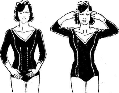 Согните мизинец и большой палец, а средние пальцы вытяните. Положение указательного пальца несущественно. Средние пальцы окажутся на точке янбэй. Сложите пальцы-кинжалы и массируйте точки девять раз внутрь и девять раз наружу, затем сделайте точечное дыхание. Детальное описание упражненияПоднимите руки до уровня бровей (см. иллюстрацию – положение 1) и прижмите мизинцы к большим пальцам, а остальные соедините в линию. Найдя точки, согните безымянные пальцы, а большие прижмите к их верхушкам, указательные перекрестите со средними (см. иллюстрацию – положение 2). Пальцами-кинжалами массируйте точки девять раз внутрь и девять раз наружу, затем сделайте точечное дыхание. Верните пальцы в обычное положение и положите их на макушку. Сдвигайте пальцы на затылок, поглаживая ими кожу головы. Массаж точки тянцу (небесной колонны)Главная формулаТянцу - название связки на задней стороне шеи. Это не точка, и определенного положения у нее нет. Массируйте (месите) се сверху вниз шесть раз и затем шесть раз поглаживайте. Объяснение упражненияТянцу относится к основным связкам задней стороны шеи и играет ту же роль, что и точка тянцу канала мочевого пузыря. Детальное описание упражнения